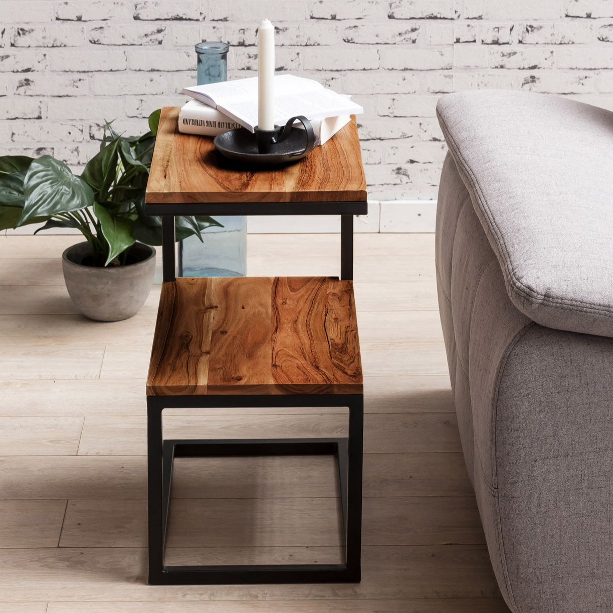 Design Stilfuldt sidebord i form af et "S" Moderne sidebord med metalramme Naturligt korn af det ædle træ To hylder giver masser af plads Dimensioner Bredde: 45 cm Højde: 60 cm Dybde: 30 cm Afstand mellem hylderne: 26 cm Maksimal belastningskapa