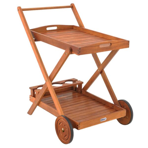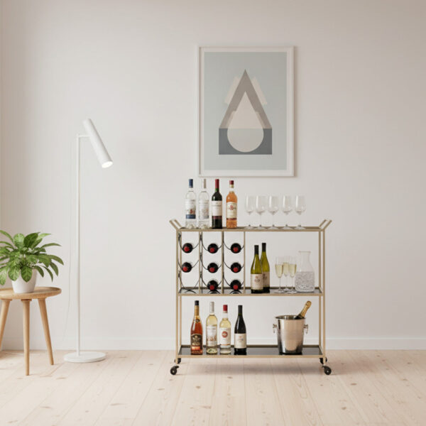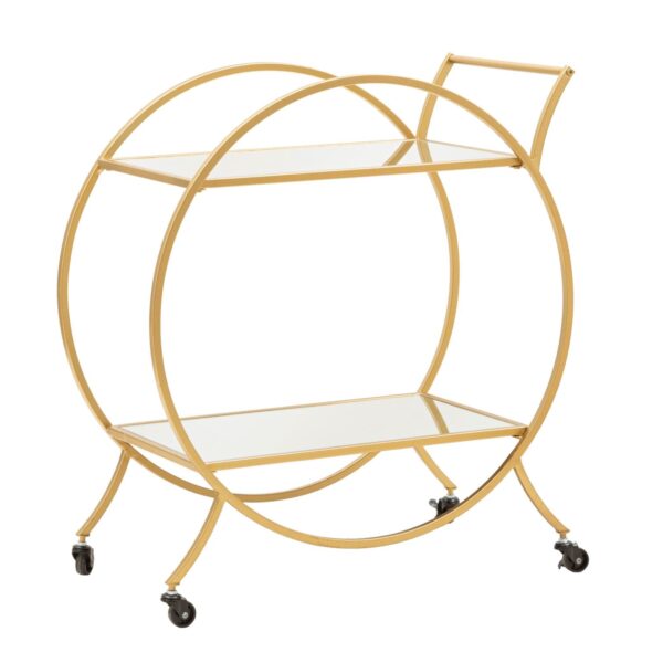 Design Guldfarvet vogn Serveringsvogn med et strejf af retro-charme Rund minibar Dimensioner Bredde: 67 cm Højde: 79 cm Dybde: 46 cm Afstand mellem hylderne: 52 cm Højde sikkerhedskant: 5 cm Jordhøjde: 14 cm Maksimal belastningskapacitet pr. Glasplade